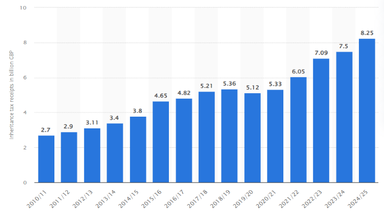 IHT receipts in the UK amounted to £8.25bn in the 2024/25 tax year, a staggering increase of over £700m from the previous tax year which was a previous peak.