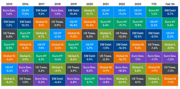 Figure 2. World Fixed Income returns, Source: JP Morgan, 29th February 2024