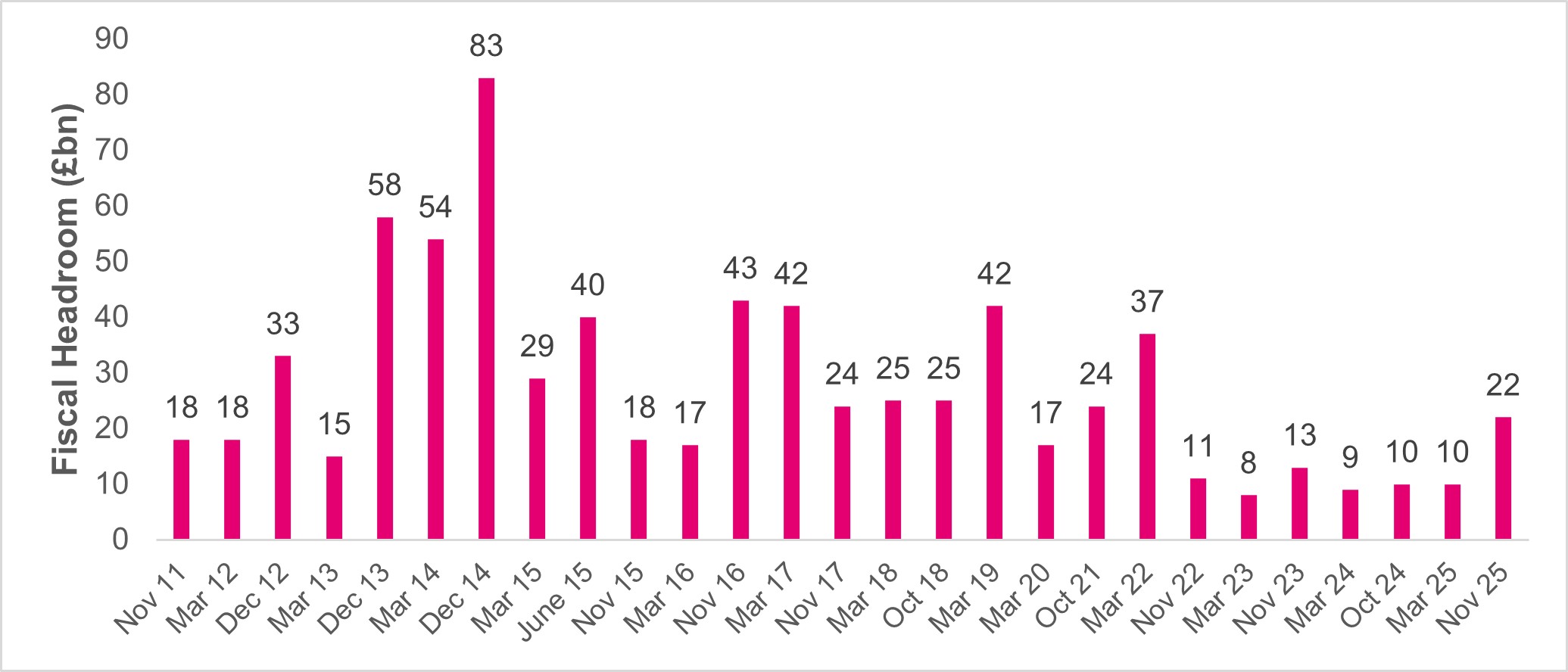 Figure 2. Forecast headroom against fiscal room (Source: Pacific Asset Management, IfG, November 2025).