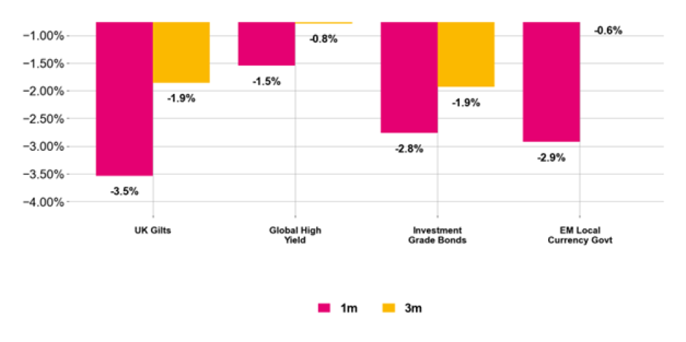 Continuing a post-pandemic trend, government bonds failed to provide the traditional 'safe-haven' shelter investors had become accustomed to during the equity market downturn. This disappointment stemmed from a sharp reappraisal of interest rate trajectories. While developed market yields had been trending lower early in the year, the prospect of conflict-driven inflation in the Middle East abruptly shifted expectations, triggering a broad sell-off across US, UK, and European government bonds in March.